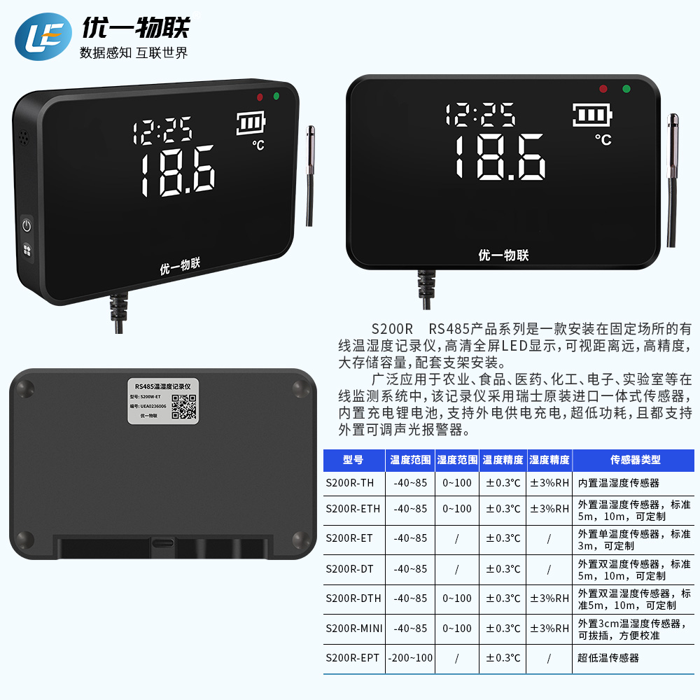 S200R RS485產品系列是一款安裝在固定場所的有線溫濕度記錄儀,高清全屏LED顯示,可視距離遠,高精度,大存儲容量,配套支架安裝。 廣泛應用于農業、食品、醫藥、化工、電子、實驗室等在線監測系統中,該記錄儀采用瑞士原裝進口一體式傳感器,內置充電鋰電池,支持外電供電充電,超低功耗,且都支持外置可調聲光報警器。